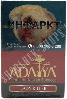 На нашем официальном сайте sherlock-shops.com вы найдете основной каталог продукции - Кальяны, уголь, табаки, расходники реализуемой в сети магазинов работающих под франшизой «Sherlock». Если Вы хотите приобрести товар: Табак для кальяна ADALYA Lady Killer 50гр, по самой доступной цене, тогда добро пожаловать в наши фирменные магазины «Sherlock».