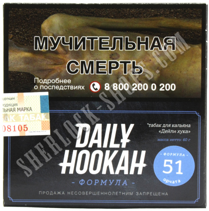 На нашем официальном сайте sherlock-shops.com вы найдете основной каталог продукции - Кальяны, уголь, табаки, расходники реализуемой в сети магазинов работающих под франшизой «Sherlock». Если Вы хотите приобрести товар: Табак для кальяна DAILY HOOKAH Орчата Формула 51 60 г, по самой доступной цене, тогда добро пожаловать в наши фирменные магазины «Sherlock».